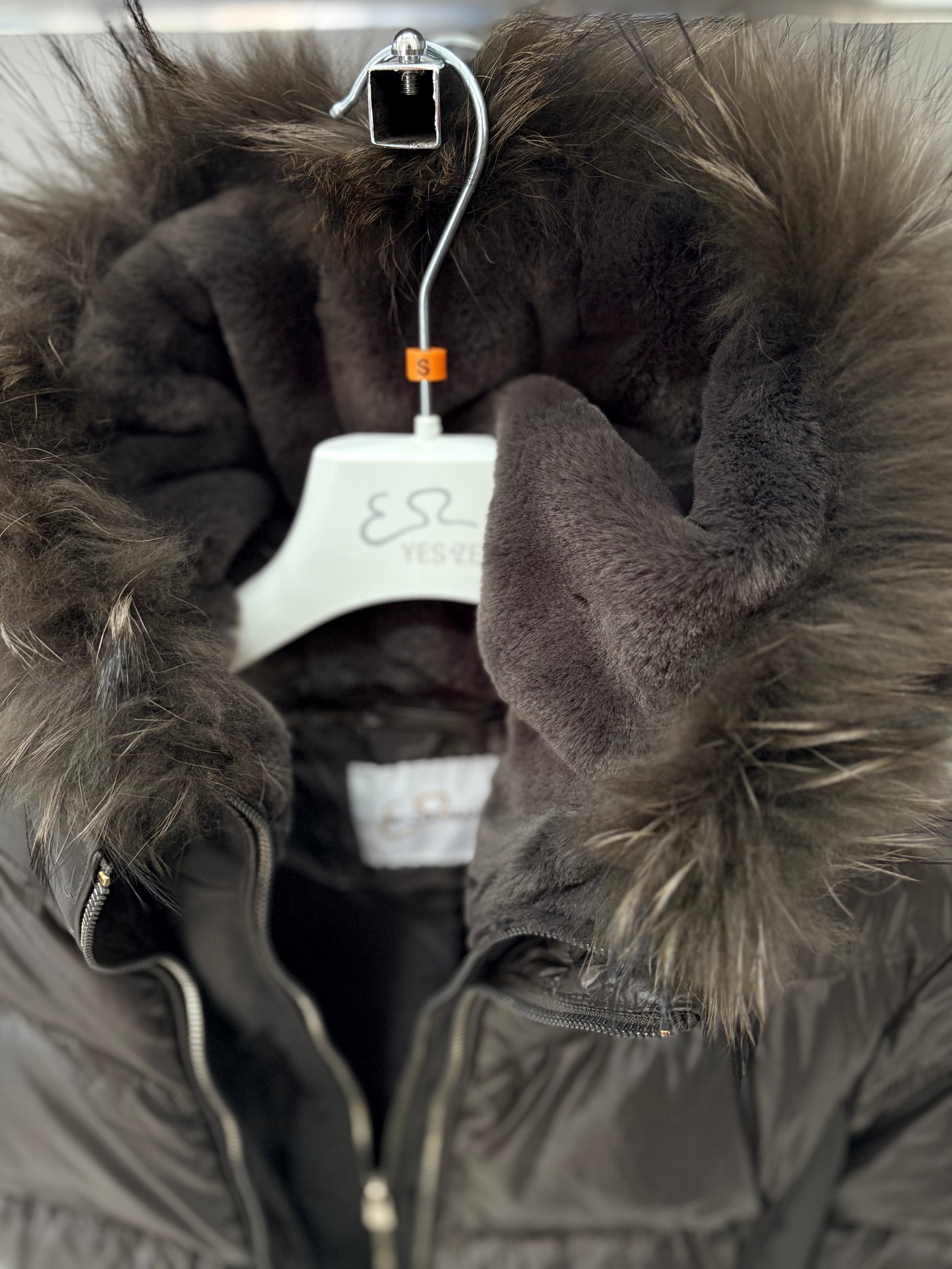 Cappotto donna trapuntato con finto gilet rimovibile , cappuccio finto e morbido teddy. Insetti in soft shell laterali.