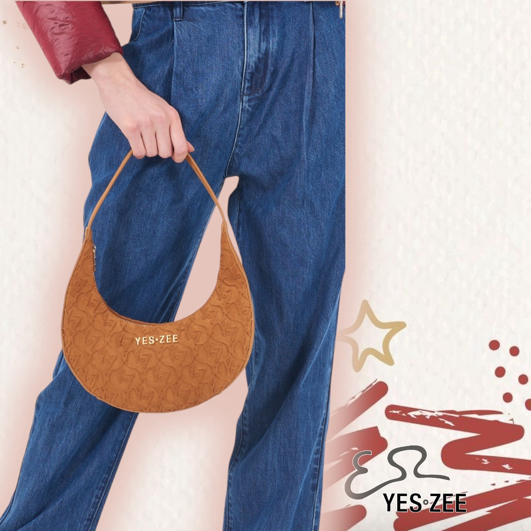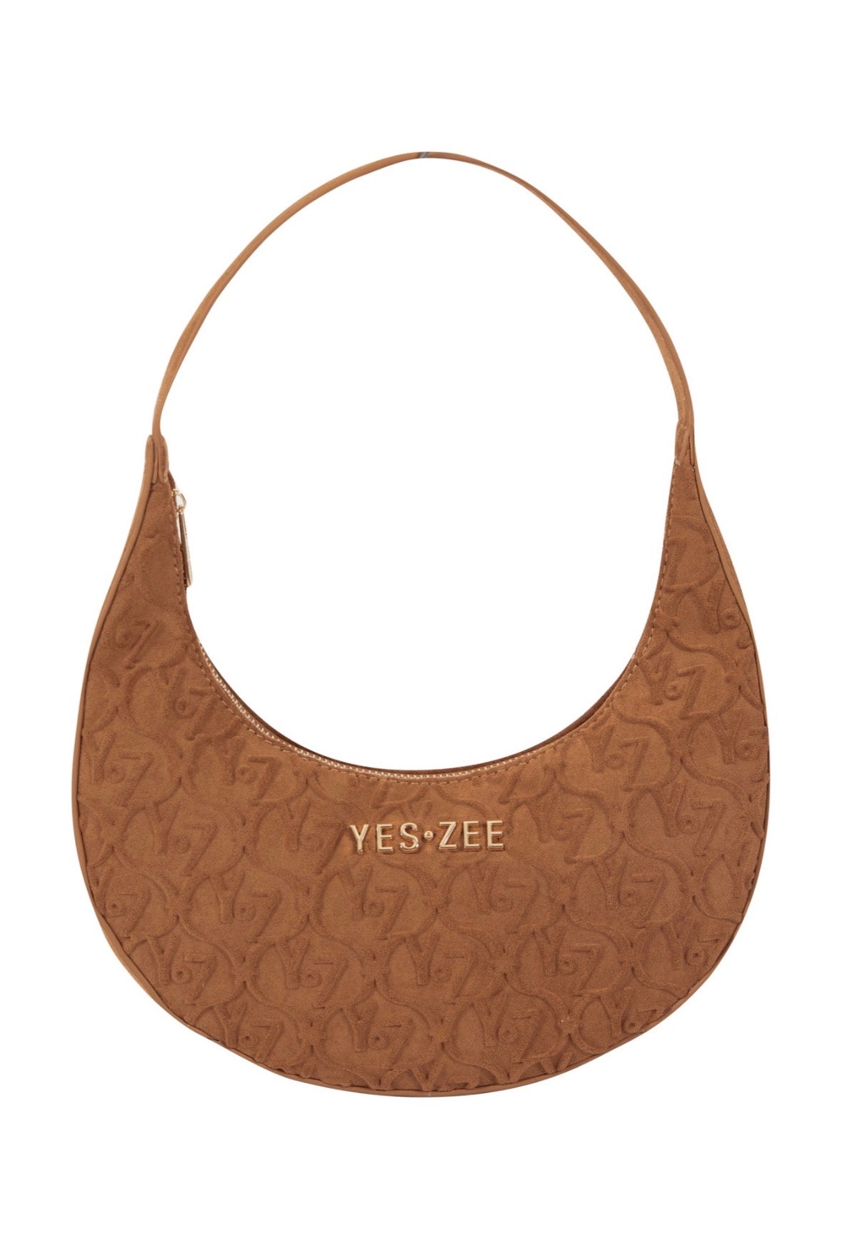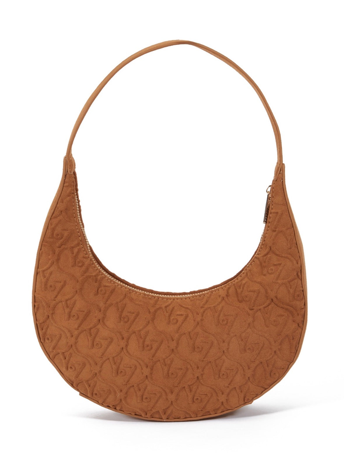 Hobo effetto cuoio, scamosciata con stampa logo in rilievo. Da portare a spalla o a mano.