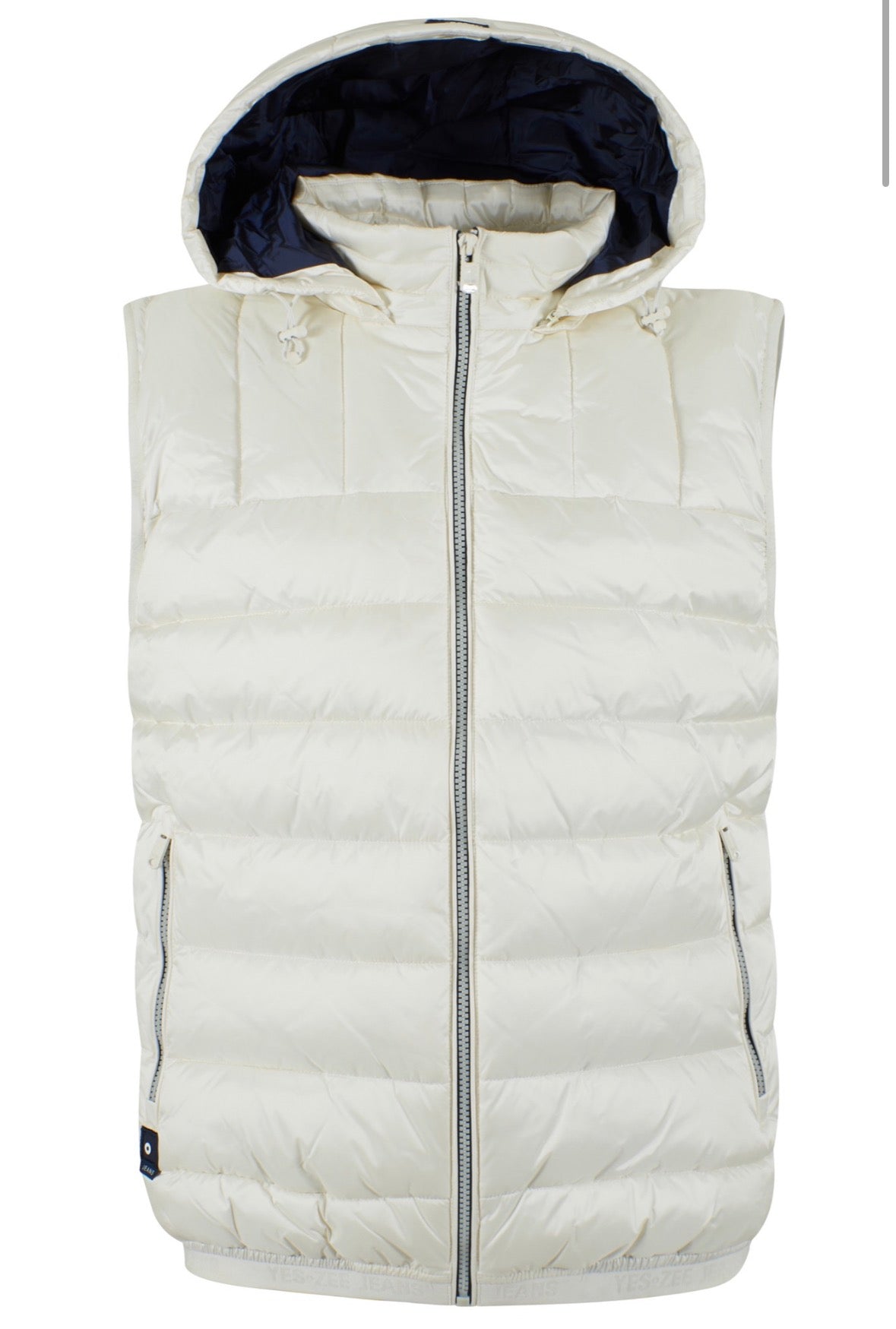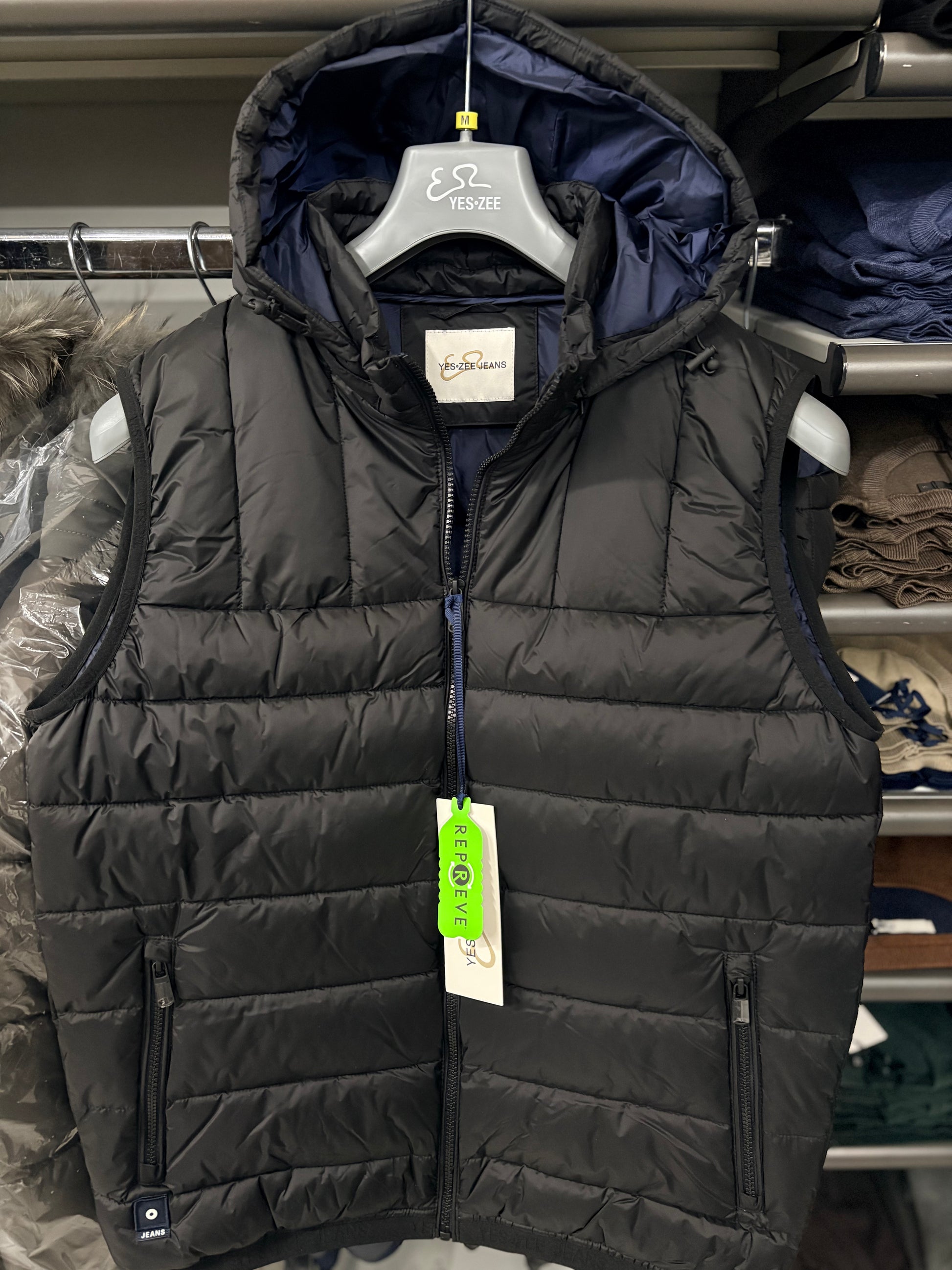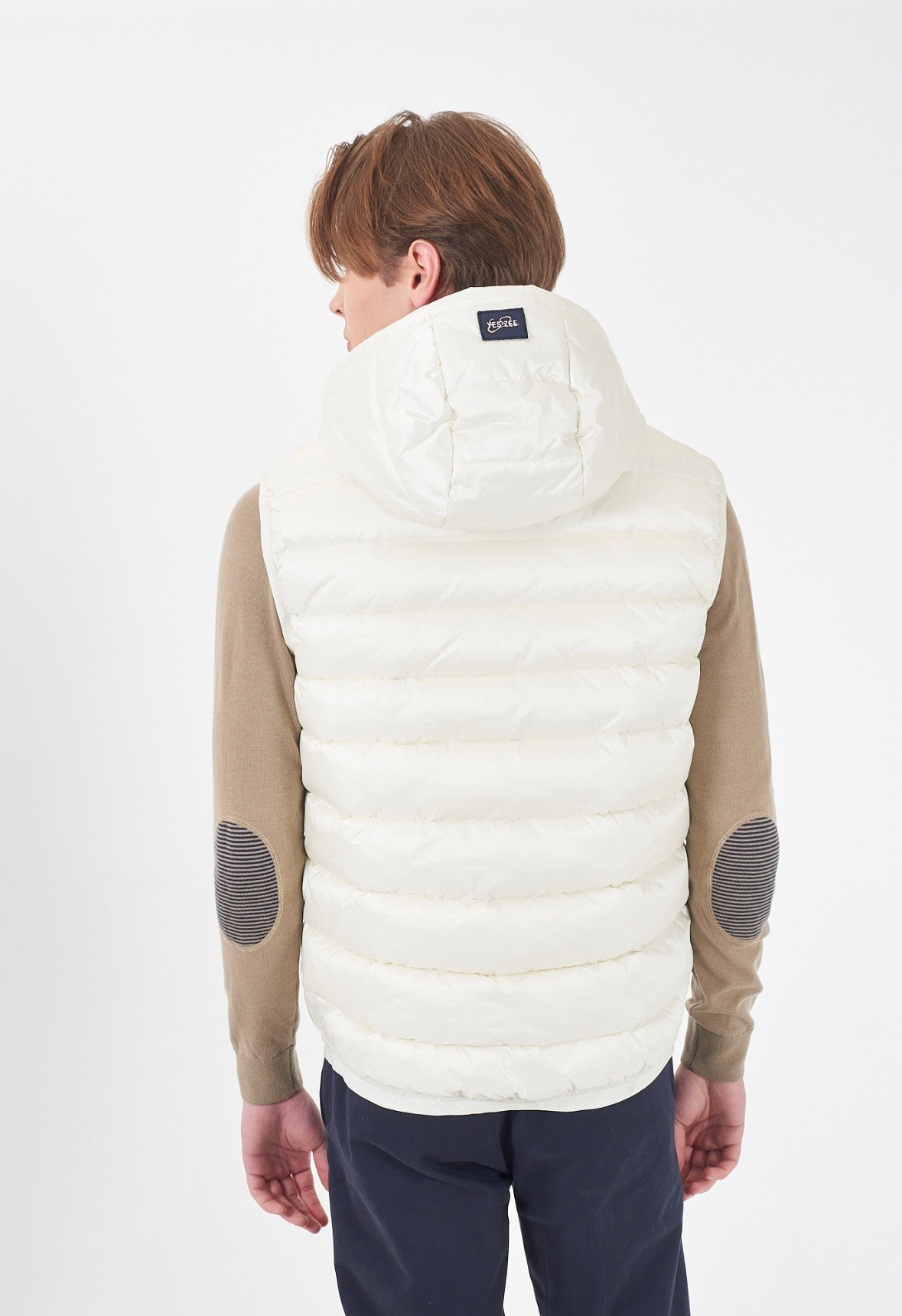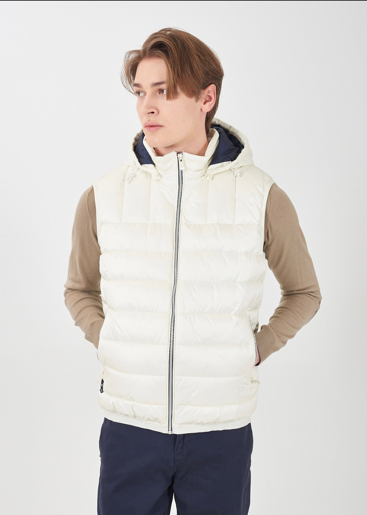 Smanicato uomo, cappuccio rimovibile. Interno fodera blu. Imbottitura riciclata.