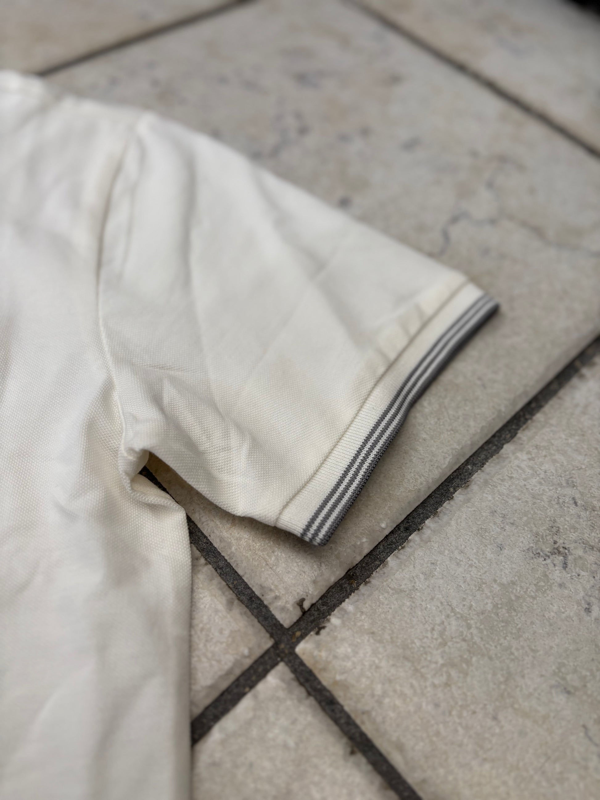 T-shirt manica corta, polo con taschino. Colletto riga grigia chiara, uguale alla manica. Spacchetto laterale sul fondo.